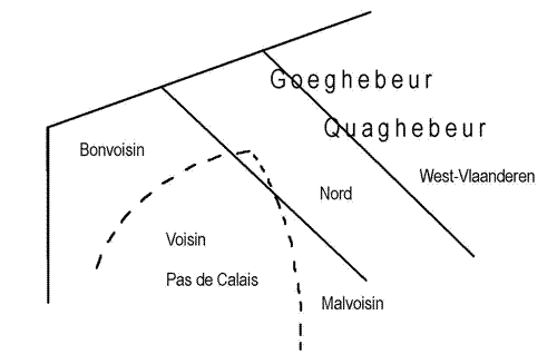 Schetsmatige weergave van de bevindingen van de heren Quaghebeur en Leys over de geografische verspreiding van de namen Quaghebeur, Goeghebeur, Bonvoisin, Malvoisin en Voisin. Uit Naamkunde 1974.