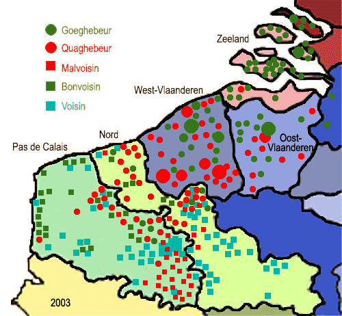 Deze kaart uit 2003 vertoont overeenkomsten, maar ook verschillen met de schets uit 1974. Voor het Franse gebied is de verspreiding van de namen Bonvoisin, Voisin en Malvoisin van Noord-West naar Zuid-Oost precies als in 1974 op grond van de steekproeven door de heren Quaghebeur en Leys verwacht werd. Een opvallend verschil is echter dat de Quaghebeurs weliswaar aan de Malvoisins raken, voor de Goeghebeurs is dat nu minder duidelijk. De namen Quaghebeur en Goeghebeur lijken iets meer een noord-zuid dan een oost-west verspreiding te hebben. Waarbij de Quaghebeurs meer in het zuiden voorkomen en de Goeghebeurs in het noorden. De grootste populaties Quaghebeurs vinden we inderdaad in de zuidelijk gelegen steden Poperinge, Ieper en Izegem. De Goeghebuers vinden we in de noordelijker gelegen steden Gent en Brugge. Het vooral in het noorden voorkomen van de laatstgenoemden zou een verklaring kunnen zijn voor het feit dat in het aangrenzende Zeeland alleen die naam werkelijk voorkomt. Hoewel de grootste populaties Goedegebuur juist niet in de gebieden voorkomen die het dichtst bij België liggen. Samenvattend lijkt de schets met name voor de Franse namen Malvoisin, Bonvoisin en Voisin te kloppen, voor Quaghebeur en Goeghebeur geldt een meer zuid-noord verdeling. Het is echter goed mogelijk dat de gebieden van oorsprong wel direct aan de Franse namen aansloten. Om dat te onderzoeken zou nog meer naar historische gegevens gekeken moeten worden, dan de heren Leys en Quaghebeur in 1974 al deden.