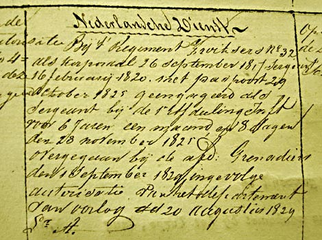 Al snel bleek namelijk dat het Regiment Zwisters nr. 32 als geheel in dienst van Koning Willem I van het Verenigd Koningrijk der Nederlanden (1815-1830) was geweest. Kommandant was sinds 1821 ene Johann Göldlin von Tiefenau en het regiment was in 1823 gelegerd in Dordrecht, lokaal ook wel bekend als Dordt! Dat klopte dus allemaal precies met het certificaat.