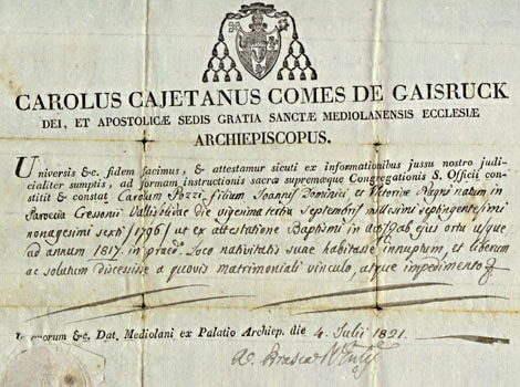 Doopbewijs uit Cressogno waarin staat dat Carlo Pozzi er geboren en gedoopt is en dat hij er bovendien tot 1817 gewoond heeft.