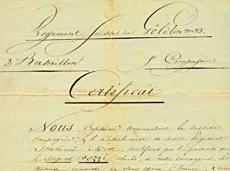 Franstalig 'Certificat' van het "Regiment Suisse de Göldlin no. 32"