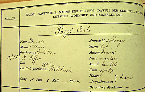 Omdat nu zeer waarschijnlijk leek dat Carlo Pozzi direct in Nederlandse dienst was gekomen zouden alle archiefstukken gewoon in het Nationaal Archief in Den Haag op te vragen zijn. In het Zwitserse register daar bleek inderdaad al snel dat de toen net 21 jarige Carlo Pozzi zich in september 1817 in de stad Schwyz in een legerdepot heeft aangemeld. De Nederlandse overheid had overal in de Zwitserse kantons aanplakbiljetten laten verspreiden en daar zal Carlo op gereageerd hebben. Schwyz was bijna 150 kilometer van zijn woonplaats. Dus Carlo had voor zijn aanmelding al een flinke reis achter de rug. Maar er was natuurlijk nog een veel groter probleem... Carlo was helemaal geen Zwitser!
