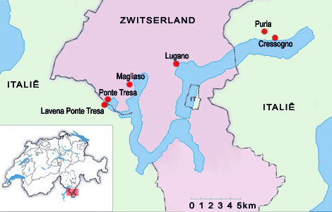 Het grensgebied Italië - Zwitserland. Carlo is in werkelijkheid in Cressogno, Italië geboren, zo'n 15 km van het grensdorp Ponte Tresa.